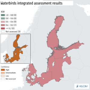 Number of cases with Total Allowable Catch (TAC) set above ICES advice for internationally managed fish stocks in the Baltic Sea during 2001-2021. The chart does not include data from Russia. The stocks included are salmon (ICES subdivisions 22-31, subdivision 32), cod (subdivisions 22-24, subdivisions 25-32), herring (subdivision 28.1, subdivisions 25-27, 28.2, 29, 32, subdivisions 30-31, subdivisions 22-24), plaice (subdivisions 22-32), and sprat (subdivisions 22-32). Cases in which ICES has advised zero catches (cod subdivisions 24-32 and herring subdivisions 22-24) are highlighted in dark yellow. Source: HELCOM 2023d.