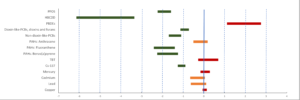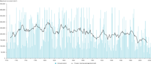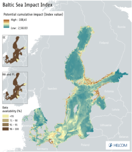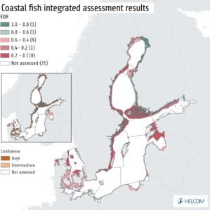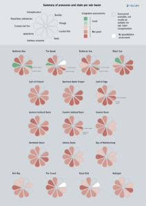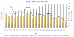 Number of cases with Total Allowable Catch (TAC) set above ICES advice for internationally managed fish stocks in the Baltic Sea during 2001-2021. The chart does not include data from Russia. The stocks included are salmon (ICES subdivisions 22-31, subdivision 32), cod (subdivisions 22-24, subdivisions 25-32), herring (subdivision 28.1, subdivisions 25-27, 28.2, 29, 32, subdivisions 30-31, subdivisions 22-24), plaice (subdivisions 22-32), and sprat (subdivisions 22-32). Cases in which ICES has advised zero catches (cod subdivisions 24-32 and herring subdivisions 22-24) are highlighted in dark yellow. Source: HELCOM 2023d.